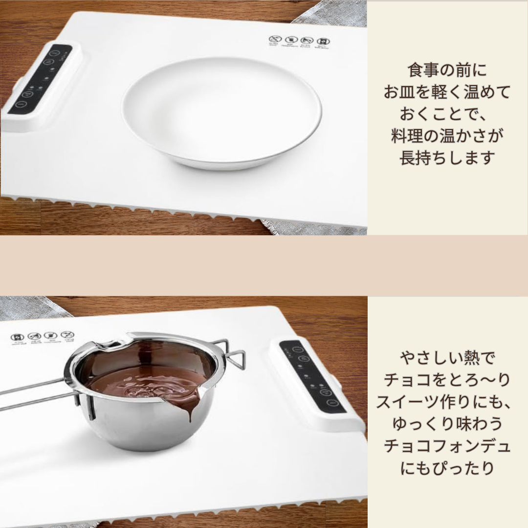 60℃・80℃・100℃の3段階で温度を自由に設定可能。食卓はもちろん、パーティーやイベントなどでも大活躍。コンパクトでスタイリッシュなデザインは、どんなテーブルにも自然に馴染みます。いつでも、どこでも、温かい料理をそのままに。